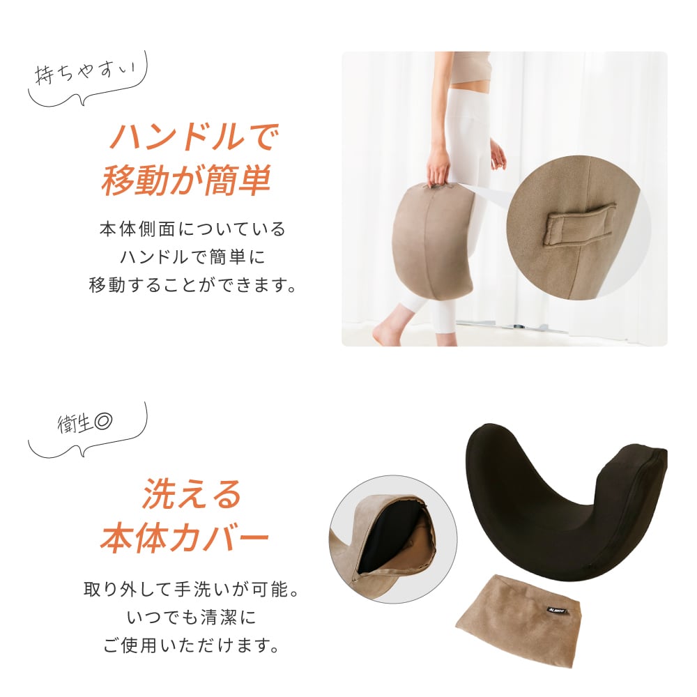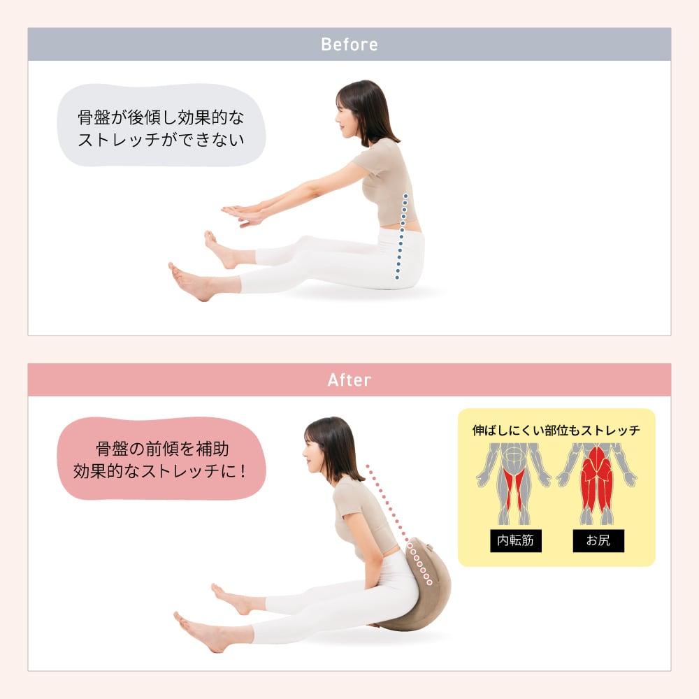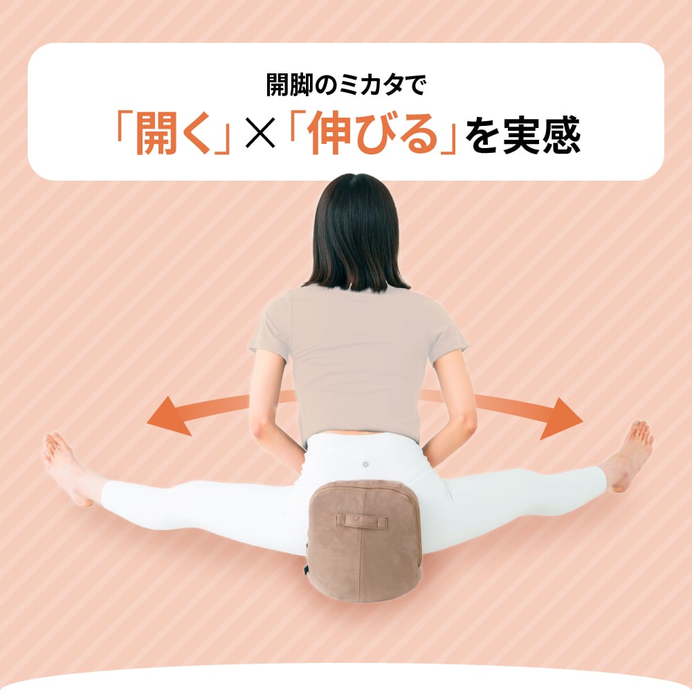 ◎本体に乗って座るだけで、普段の姿勢では伸ばしにくい、股関節のストレッチをサポートするストレッチクッション